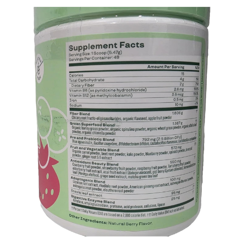 Balance gut health, fight bloat, and promote energy in the most delicious way. Made with 38+ good-for-you ingredients, including fruits & vegetables, digestive enzymes, fiber, probiotics, and more, this amazing greens and superfood is an internet favorite for a reason. Just add one scoop to 8 oz. or more of water, juice, smoothie or you favorite beverage daily. One bottle contains 48 servings Relieves uncomfortable bloat, aids digestion, supports gut health, and promotes energy Made with fruits & vegetables, digestive enzymes, pre & probiotics, fiber, and more